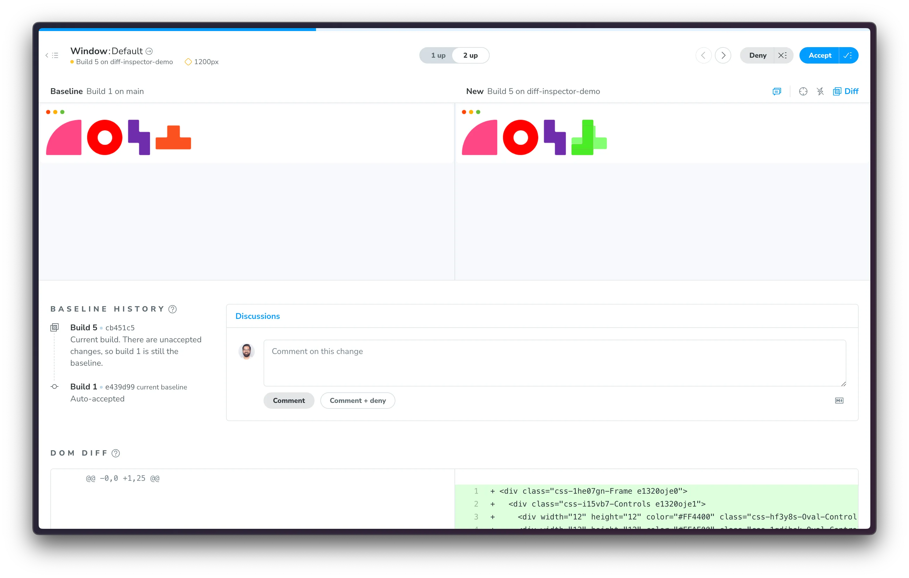 - Unified view (1 Up): See changes directly overlaid on top of your baseline for a focused comparison.